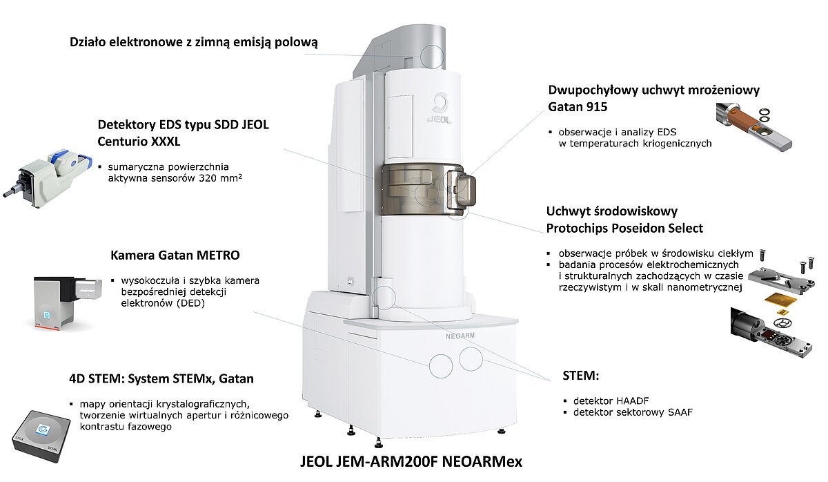 Laboratorium dysponuje mikroskopem JEOL JEM-ARM200F NEOARMex przeznaczonym do pracy w trybach TEM, STEM i 4D-STEM. Mikroskop dedykowany jest do wysokorozdzielczych obserwacji i analiz chemicznych w skali mikro-, nano- i atomowej oraz badań środowiskowych in-situ w cieczach i w temperaturach kriogenicznych. Zakres powiększeń obrazów mikroskopowych w TEM wynosi od 50 x do 1 500 000 x.